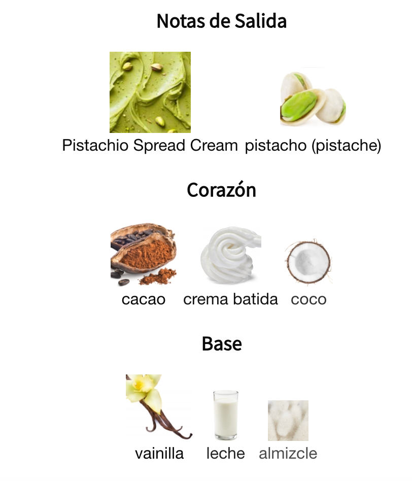 - Notas de salida: Crema de pistacho, Pistacho tostado (apertura rica y "nutty")