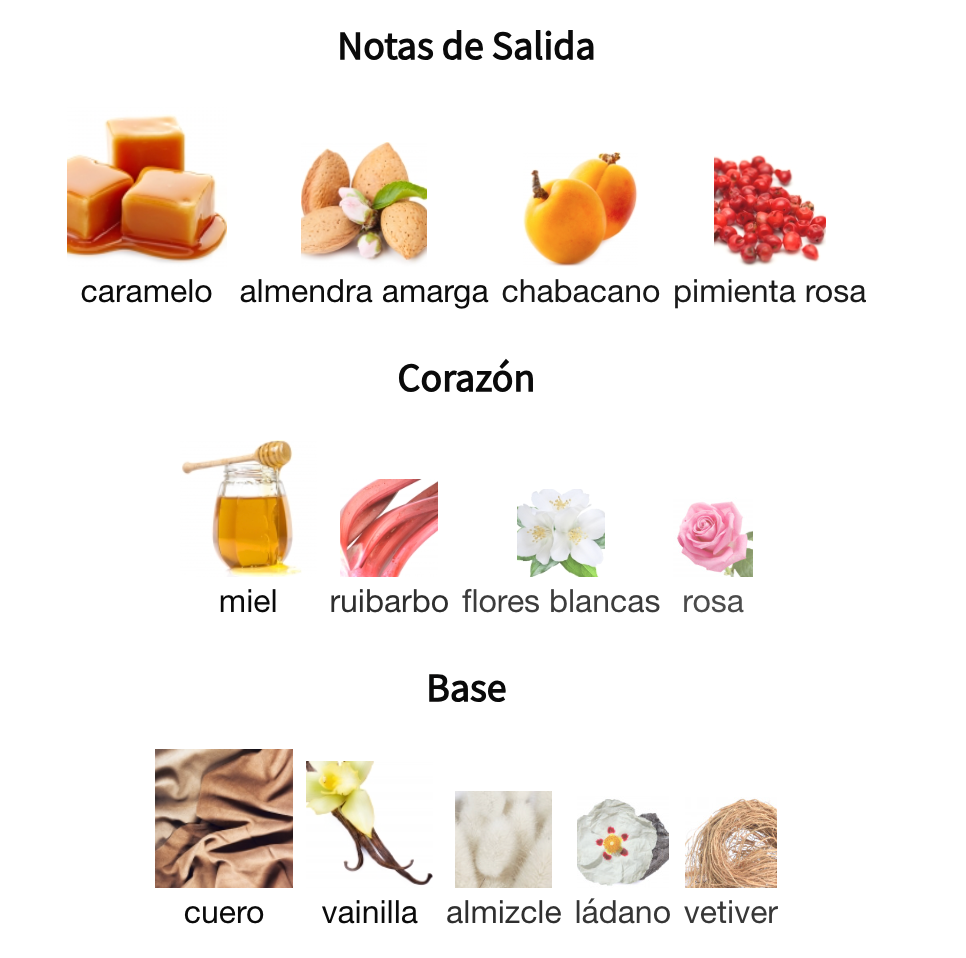 - Notas de salida: Caramelo, Almendra amarga, Pimienta rosa, Chabacano (apertura dulce y texturizada)